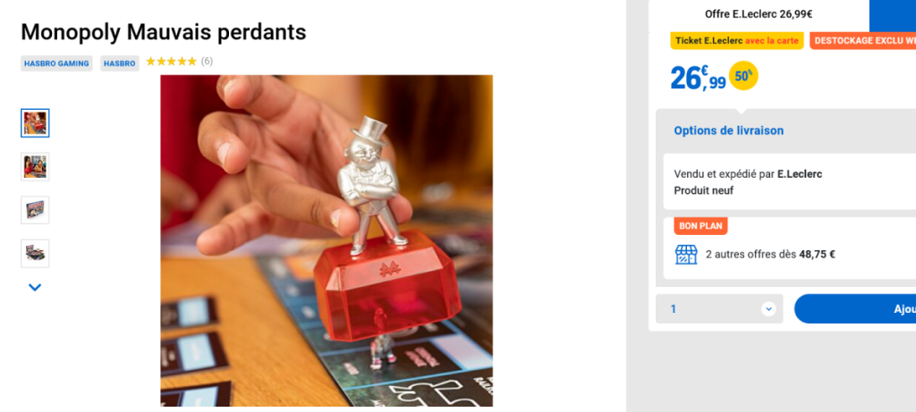 Q4 : Puis-je acheter le Monopoly Mauvais Perdants dans un autre magasin que Leclerc ? R4 : Oui, mais l’offre combinée de remise fidélité et de remboursement ODR est spécifique à Leclerc.