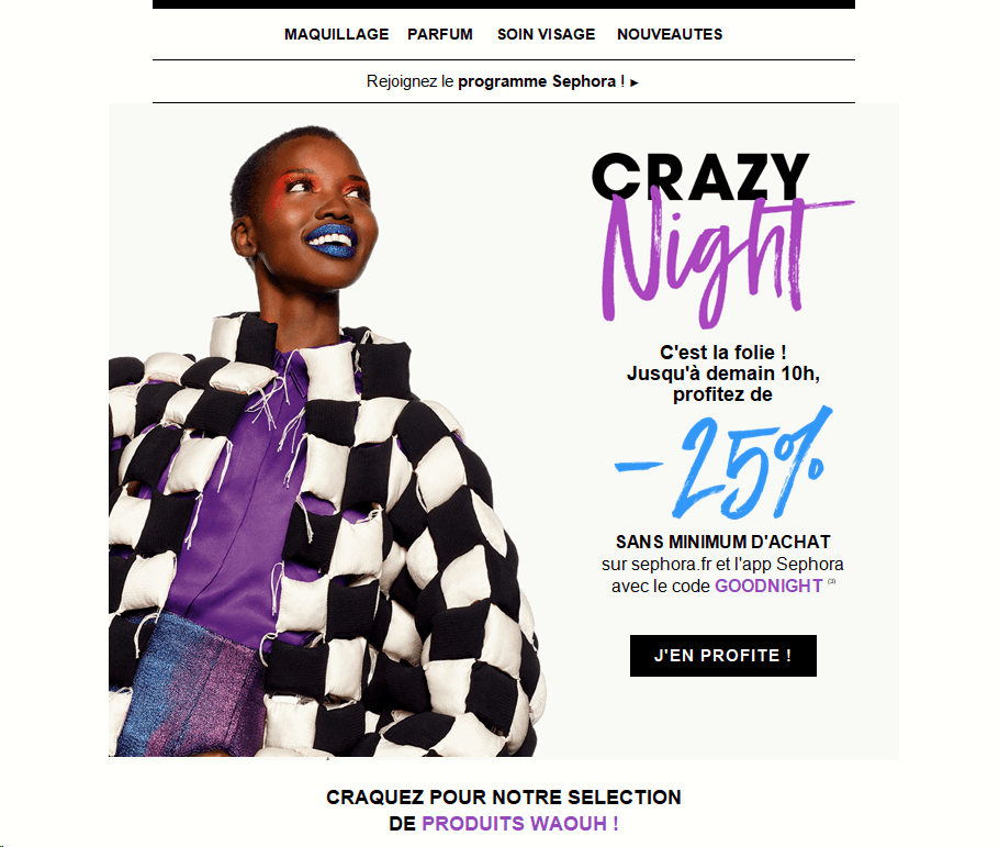 Code GOODNIGHT jusqu'à demain lundi 10h pour bénéficier d'une remise de 25% sans minimum. Et toujours www.sephora.fr