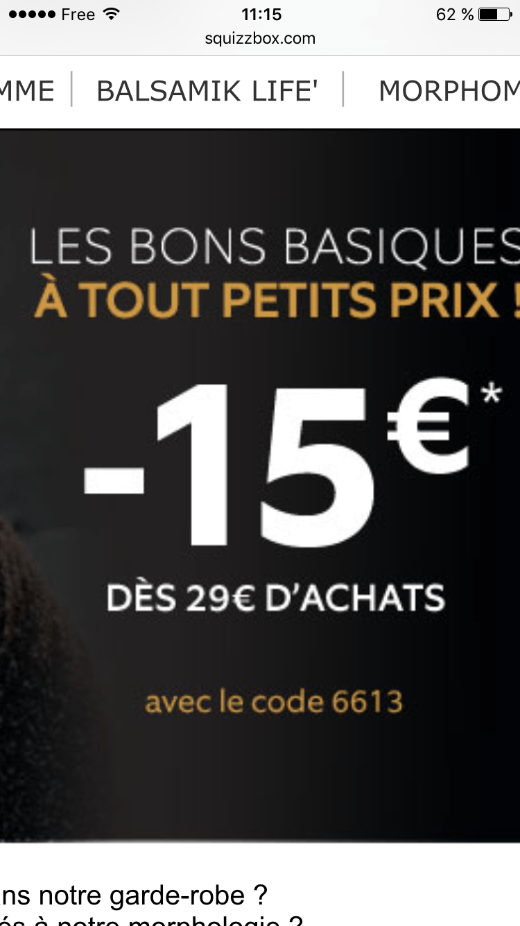*Bénéficiez de -15€ de réduction dès 29€ d'achats facturés sur les articles de la collection automne-hiver 2015-2016. Offre personnelle valable uniquement sur Balsamik.fr, du 24 novembre au 7 décembre 2015 inclus, non cumulable avec une autre offre promotionnelle. Cette offre n'est pas cessible, ni utilisable partiellement et n'entraînera aucune contrepartie monétaire sous quelque forme que ce soit. La réduction est répartie sur chacun des articles au fur et à mesure de la facturation. En cas de retour vous serez remboursé à hauteur de la valeur du montant réparti. Réductions non applicables, aux prix rouges, prix barrés et articles déjà démarqués.