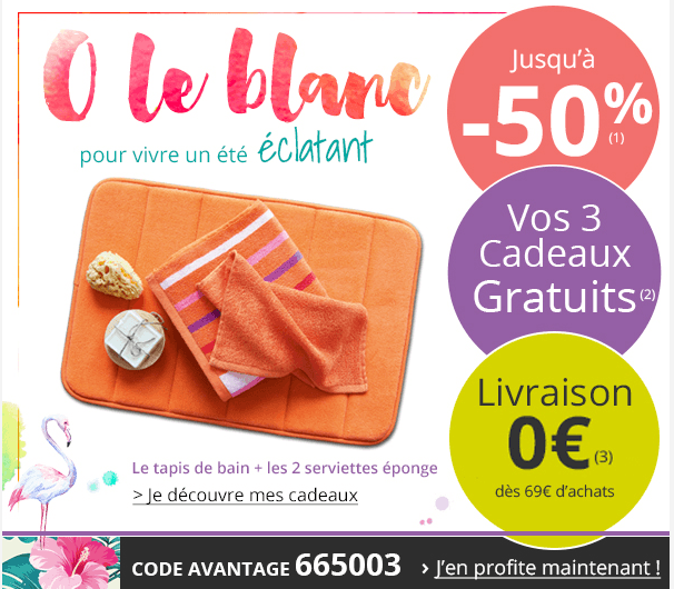 (1) Jusqu'à -50% sur la sélection Blanc : Offre valable jusqu'au 23/05/2017 dans la limite du stock disponible. Non cumulable avec une autre remise et hors prix astérisques.
