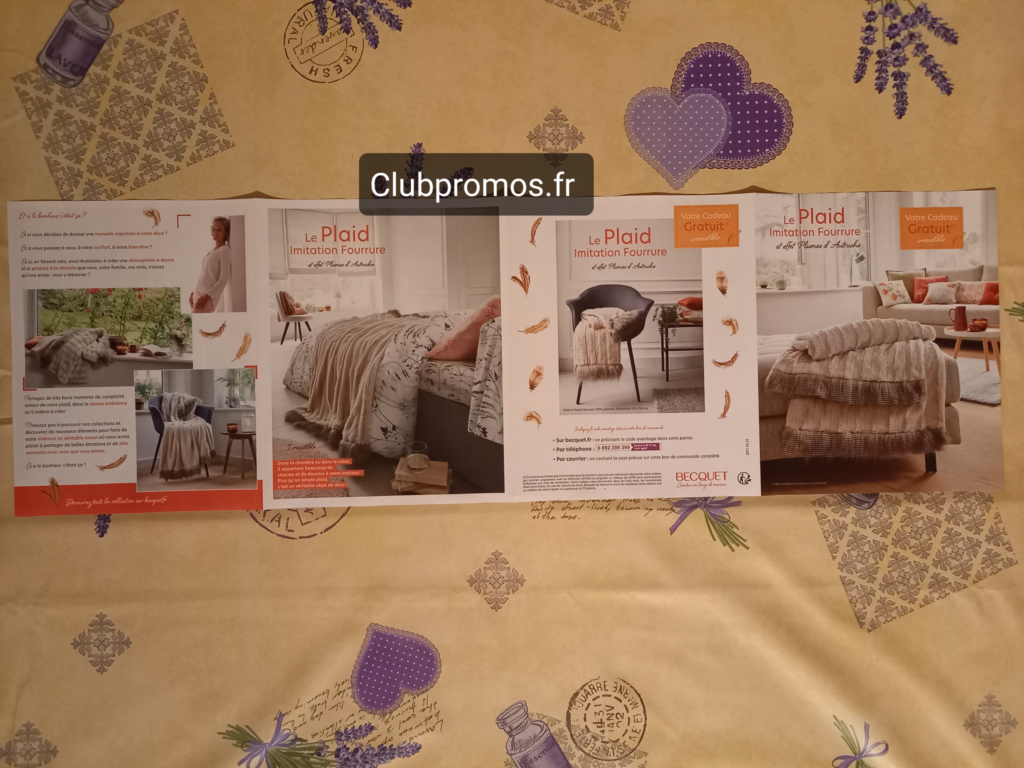 [Message caché]de chez Becquet qui donne en cadeau ? pour toute commande un joli plaid imitation fourrure et effet Plumes d' Autruche, 100% polyester, dimensions : 110 × 150 cm, voir photos ?. Il y a aussi une remise de 40% sur la nouvelle collection Hiver. Sinon pour celles ou ceux qui ne veulent pas le plaid, il y a aussi le code 301502 qui donne 70 points fidélité. Les frais de port sont offerts dès 79 euros d'achats.