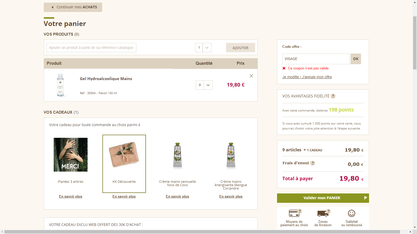 J ai reçu un autre code donnant en plus des cadeaux du site un autre cadeau a partir de 11 euros code VISAGE dans code offre frais de ports gratuits 15 euros. Cadeau du site + huile demquillante waterproof anti pollution plus detox