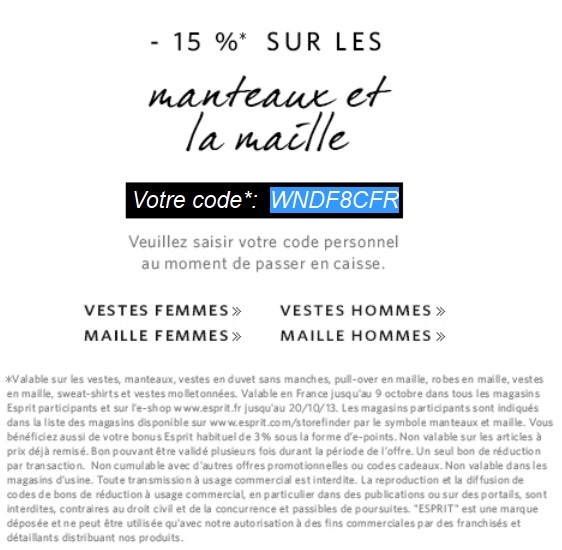 Profitez du bon de réduction - 15 % ci-joint, réservé aux membres Esprit Friends, à valoir sur les parkas, manteaux, doudounes, pulls, gilets en maille ainsi que sur les sweatshirts et les vestes molletonnées.