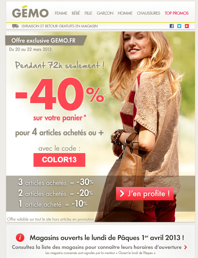 *Du 20 au 22 mars 2013, pour 4 articles achetés ou plus, -40% de remise sur votre panier. Pour 3 articles achetés, -30% de remise sur votre panier, pour 2 articles achetée, -20% de remise sur votre panier et pour 1 article acheté, -10% de remise sur votre panier. L'offre n'est pas cumulable avec les promotions en cours. L'offre n'est pas valable sur les produits éligibles aux opérations commerciales, signalés par un pictogramme. L'offre n'est pas cumulable avec d'autres bons d'achat ou de réduction, ou les Soldes. Offre valable 1 seule fois par client et uniquement sur GEMO.FR.