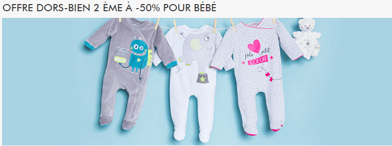 Du 1er janvier au 31 décembre 2017, sur les articles signalés, pour 1 article acheté, -50% de remise sur le 2ème, sur le moins cher des 2 articles. Les associations entre les articles Femme, Homme, Bébé, Fille et Garçon sont possibles. L'offre n'est pas cumulable avec d'autres promotions, les offres commerciales en cours ou les Soldes.