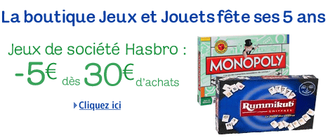 Du 6 avril 2012 15h au 15 avril 2012 inclus, achetez en une seule commande 30 euros dans la gamme de jeux de société Hasbro ci-dessous et bénéficiez de 5 euros de remise immédiate avec le code HASBRJEU.
