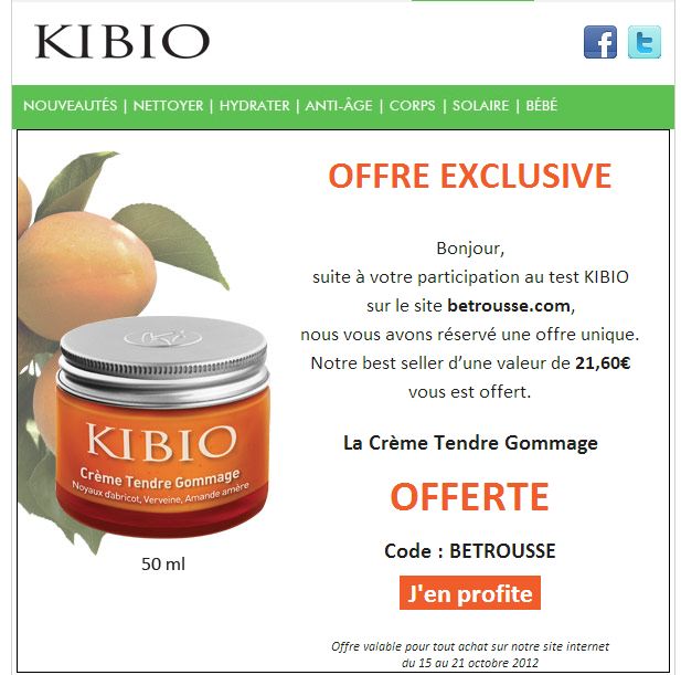 Crème de gommage d'une valeur de 21.60 euros offerte pour toute commande avec le code BETROUSSE valable du 15 au 21 octobre Kibio :icon_rolleyes:
