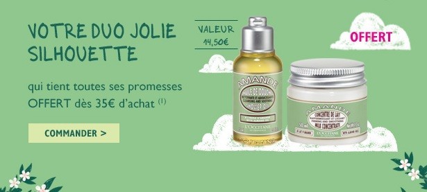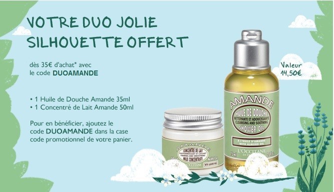 Offre strictement personnelle, valable une seule fois pour tout achat d'une valeur supérieure ou égale à 35€ ,du 03/04/2013 au 28/04/2013 inclus dans la limite des stocks disponibles sur loccitane.fr avec le code DUOAMANDE et dans les boutiques participant à l’opération (liste sur www.loccitane.fr/boutique/amande2013).