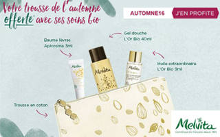 La trousse de l'automne de Melvita contient 1 Gel douche L'Or Bio 40ml, 1 Baume à Lèvres Apiscoma 3ml et 1 huile extraordinaire 9ml. Code AUTOMNE16 Melvita Pour info la validité de cette offre était annoncée au 31/10/16, en profiter vite avant qu'elle ne soit désactivée;