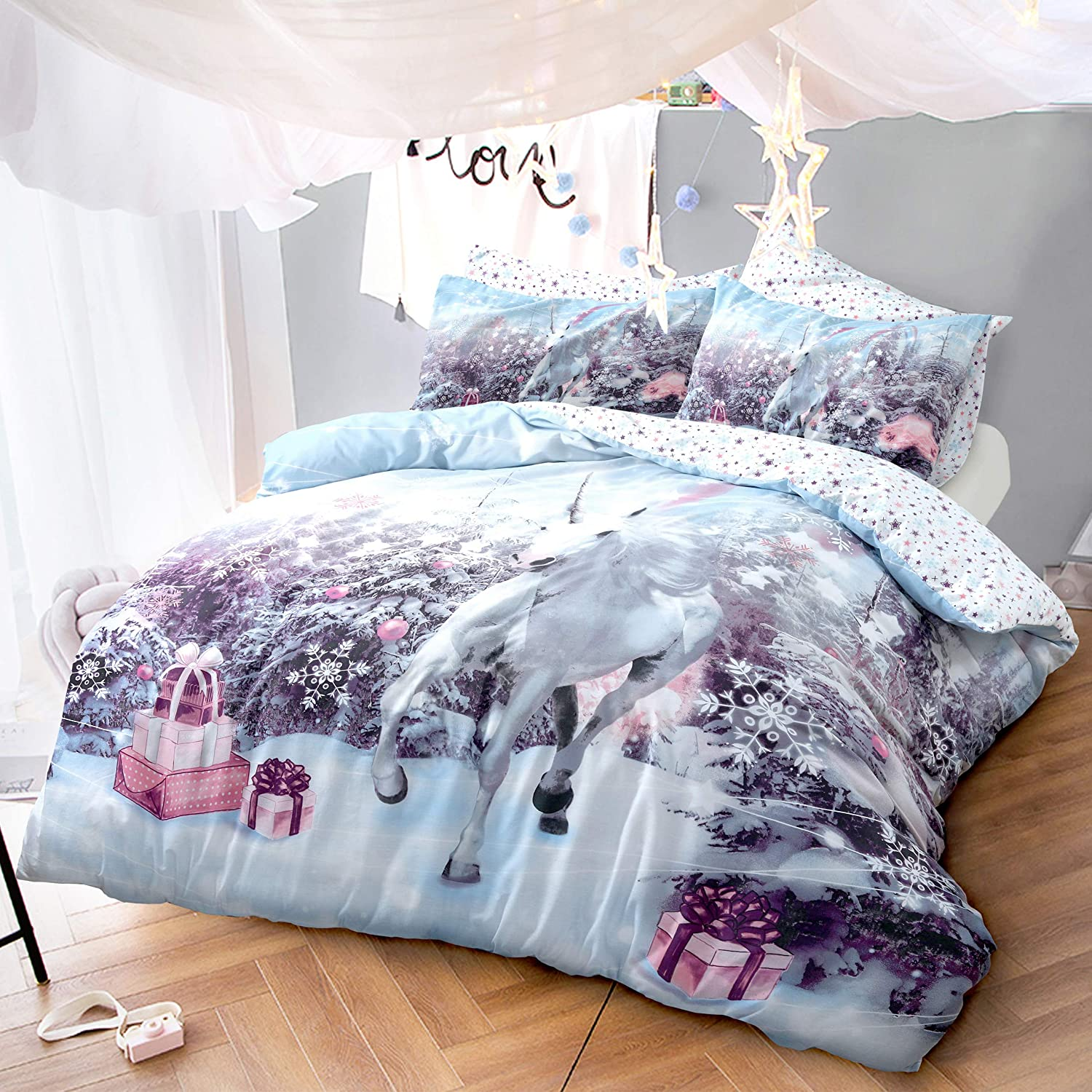• L'ensemble imprimé licorne de Noël dispose d'une grande licorne avec des flocons de neige et présente un design qui est suivi sur les taies d'oreiller et les étoiles sur le revers.