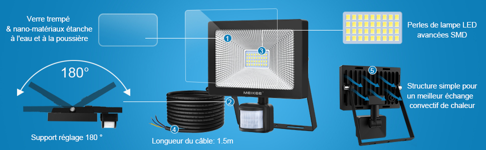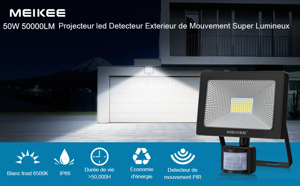 Projecteur exterieur détecteur de mouvement MEIKEE 50W 5000LM 6500K lampe LED extérieur infrarouge PIR Lumière de sensibilité Capteur réglable étanche IP66 pour Chantier, Couloir, Garage, Terrasse [Classe énergétique A+]