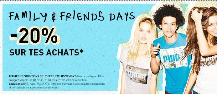 -20% de réduction sur vos achats à l'occasion de l'opération Family & Friends days sur Puma Shop jusqu'au 25 mars à 23:59. La livraison est gratuite dès 30€ et surtout les retours le sont aussi ! :eek: