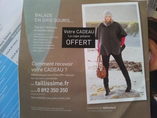 En cadeau une cape en polaire grise et 30% de réduc sur un article du catalogue AH Taillissime ou même du site (sauf prix rouge, prix d'amie et prix verts)