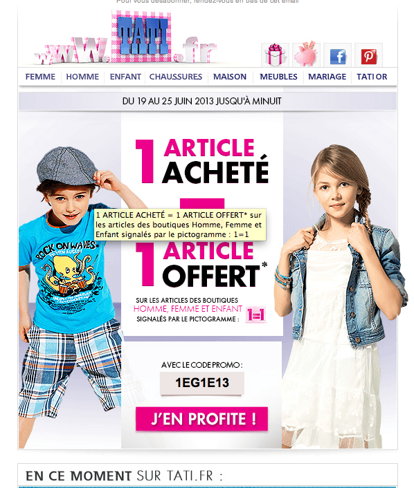 *Offre "1 article acheté, 1 article offert" valable du 19 au 25 juin 2013 jusqu'à minuit pour une commande réalisée sur le site Tati.fr, sur les articles des boutiques Homme, Femme et Enfant identifiés par le pictogramme "1=1". Le produit offert est le moins cher des 2 articles mis au panier de commande. Dans la limite de 4 produits offerts. Offre non cumulable avec d'autres promotions en cours. Ce code promotionnel ne peut faire l'objet d'aucun remboursement en espèces ni d'aucune contrepartie de quelque nature que ce soit.