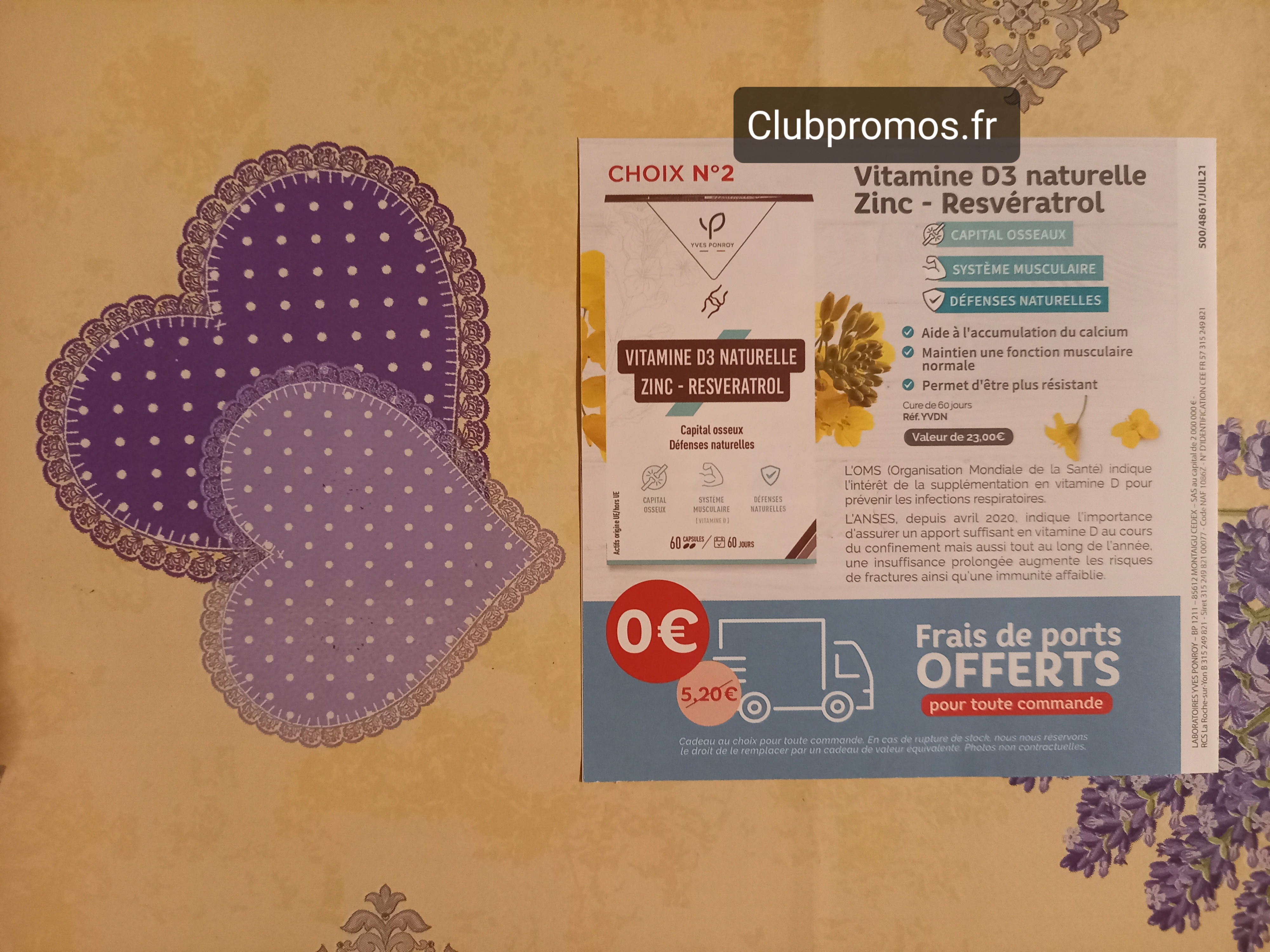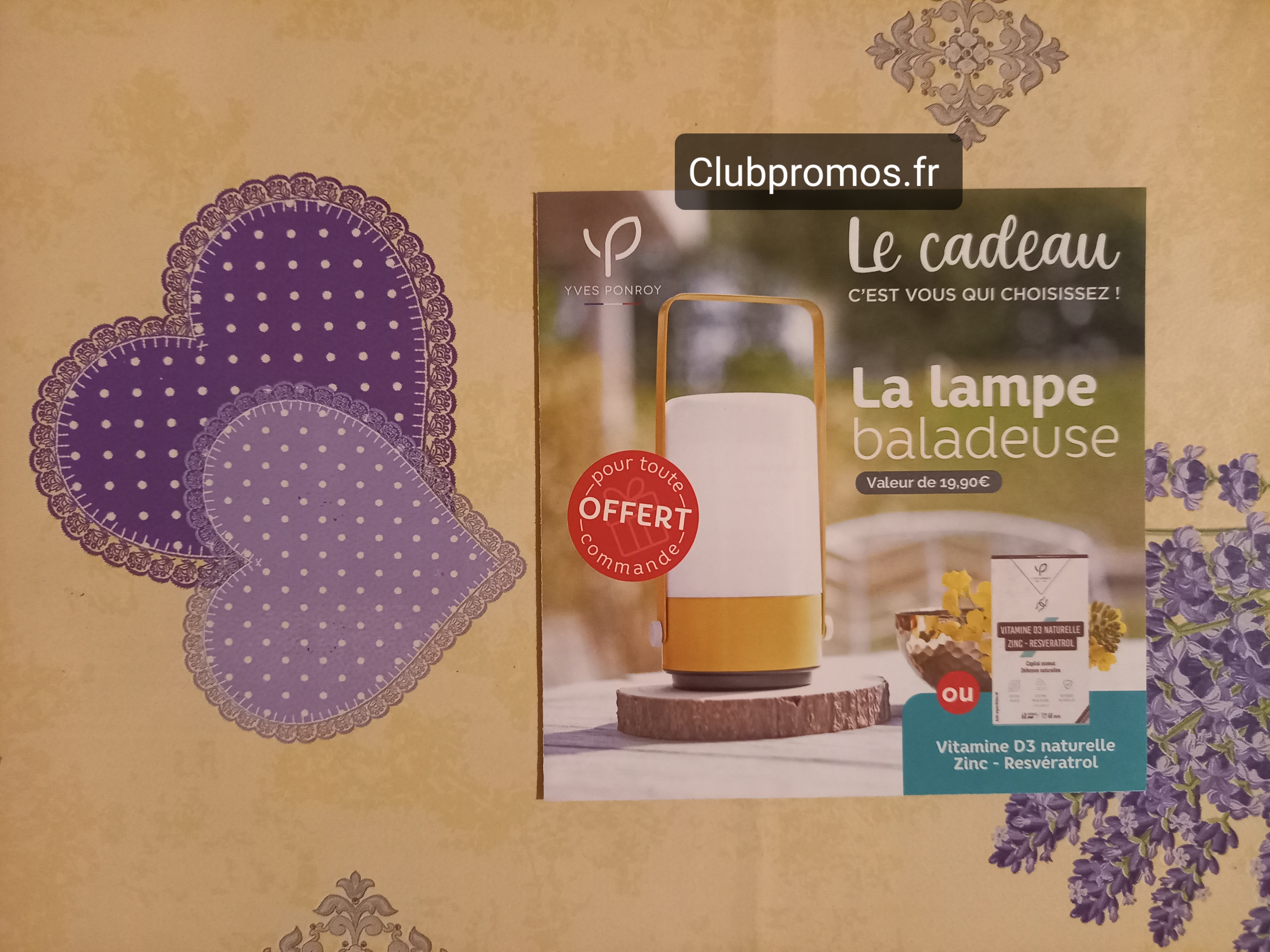 Merci bcpVoici le code [Message caché] de chez Yves Ponroy qui donne en cadeau ? pour toute commande une jolie lampe ? baladeuse ou au choix une boîte de 60 capsules de vitamine D3 naturelle Zinc Resvératrol (voir photos ?). Les frais de port sont offerts.
