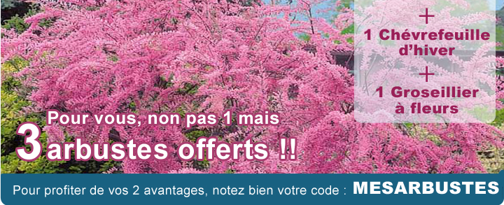 Offre non cumulable, valable uniquement sur Internet, hors assurance et livraison, jusqu'au 11/05/2010. Si vous ne souhaitez pas commander, vous pouvez néanmoins recevoir vos 3 arbustes en envoyant votre demande sous enveloppe neutre affranchie à l'adresse suivante : Willemse France - service Internet - 59984 Tourcoing Cedex, en envoyant un chèque de 5,99 euros pour participation au frais de traitement et de mise à disposition. En cas d'indisponibilité, Willemse France s'engage à vous remettre un cadeau d'un prix de revient égal ou supérieur. Les frais de port vous sont offerts dès 19 euros d'achats.
