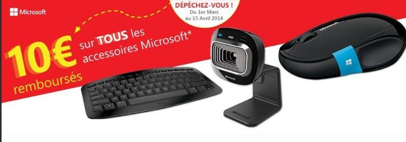 Recevez un remboursement de dix euros (10€) par virement bancaire pour l’achat d’un Accessoire PC et Tablette Microsoft. Valable à partir de dix euros d’achat (10€), pour toutachat effectué entre le 1er Mars inclus et le 15 Avril inclus (hors Accessoires Surface). Offre valable du 01/03/2014 au 15/04/2014.