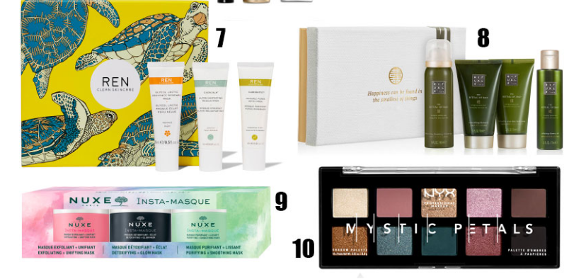 1. Coffret relaxant Sanctuary Spa (14,95€ au lieu de 20,95€) – 2. Cracker de soins visage Caudalie (8,96€ au lieu de 11,95€) – 3. Craker de soins pour cheveux Aveda (15,71€ au lieu de 20,95€) – 4. Coffret duo lèvres Nars (19,48€ au lieu de 25,95€) – 5. Coffret lèvres et yeux Stila (19,95€ au lieu de 28,95€) – 6. Coffret de pinceaux visage et yeux Real Techniques (17,58€ au lieu de 23,45€) – 7. Coffret trio de masques pour le visage Ren (19,48€ au lieu de 25,95€) – 8. Coffret Rituals (15,71€ au lieu de 20,95€) – 9. Coffret Insta-Masque Nuxe (17,21€ au lieu de 22,95€) – 10. Palette de 10 fards à paupières Nyx (12,95€)