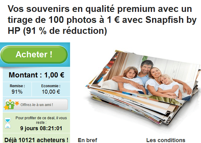 Un deal Snapfish intéressant qui permet de développer 100 photos 10x15cm en qualité premium, pour 1€ sur Groupon. + frais de port en sus de 4.99€.