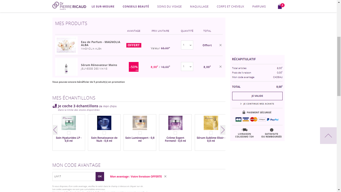exemple de panier avec l'eau de parfum magnolia alba en cadeau et 8€ de produits, fdp0 :