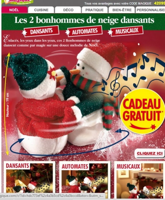 Mme bonhomme de neige vêtue d'un haut rouge brillant ainsi que le bas des manches, de gants verts, un bonnet vert bril- lant avec bord blanc haut du bonnet resserré , fleur rouge avec centre jaune sur le côté du bonnet. Les 2 personnages ont le visage blanc, yeux noirs, pommettes roses, bouche formée par 5 points noirs, nez orange en forme de carotte. Corps blanc.
