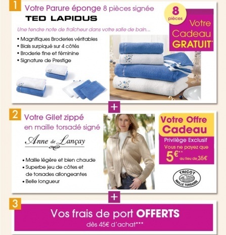 [FONT=Verdana, Geneva, sans-serif]* Cadeau Gratuit Parure éponge 8 pièces signée TED LAPIDUS : si vous ne commandez pas aujourd'hui mais souhaitez recevoir votre cadeau, merci d'imprimer cet e-mail et de le retourner exclusivement par courrier à Damart 59086 Roubaix cedex 2, accompagné d'un chèque de 5 euros libellé à l'ordre de Damart pour participation aux frais de mise à disposition. Votre cadeau vous parviendra après le 03/09/2012. Si malgré nos précautions votre cadeau venait à manquer, nous le remplacerions par un cadeau d'une valeur commerciale équivalente ou supérieure. Composition et dimensions: 50 x 70cm - serviettes d'invité : 30 x 30cm - gants : 15 x 21cm. Parure lavable en machine à 40°. Eponge 100% pur coton.
