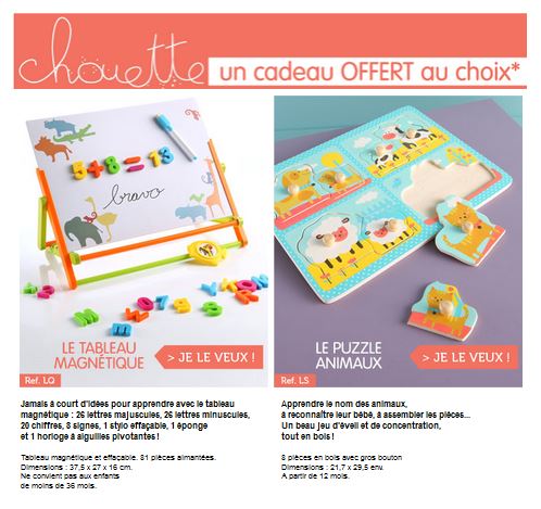 Profitez de 20% de réduction + un cadeau au choix (un puzzle ou un tableau magnétique) chez Vertbaudet grâce à ce code promo :
