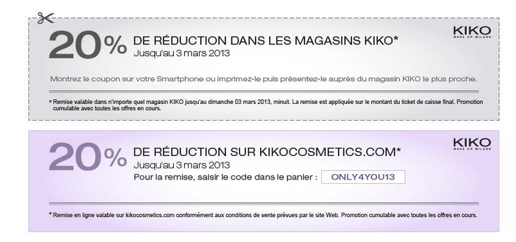 Du 22 février au 03 mars, présentez en magasin le Coupon que vous trouvez ci-dessous et recevez une réduction immédiate sur tous les produits KIKO y compris sur les éditions limitées et sur les articles déjà en promotion.