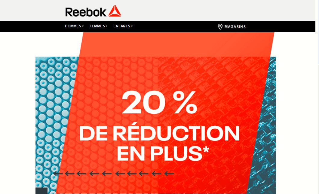 *Offre à durée limitée valable jusqu’au 31/03/2019 inclus. Ce code promotionnel est un code à usage unique, uniquement applicable aux commandes passées sur notre site Reebok.com et à destination de la France. Ce code est valable sur des produits des gammes Homme, Femme et Enfant de la boutique Outlet de Reebok.com et donne droit à 20 % de remise supplémentaire sur les prix affichés. La réduction ne s’applique pas aux frais de port, n’est pas valable sur les achats antérieurs et ne peut être cumulée avec d’autres offres ou codes promotionnels. D’autres exclusions sont susceptibles de s’appliquer. Celles-ci seront précisées sur le site Reebok.com. En cas de retour ou d'annulation, veuillez consulter la section « Retours » de notre page « Besoin d’aide ? » sur Reebok.com