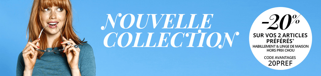 Offre valable sur les produits stickés "Nouvelle Collection" jusqu'au mardi 6 septembre 2016 à l’exception des produits signalés «prix chou», des "prix mini" et des garanties (hors éco-participations). Offre non cumulable avec d'autres offres et valable dès 2 articles « Nouvelle collection » achetés.