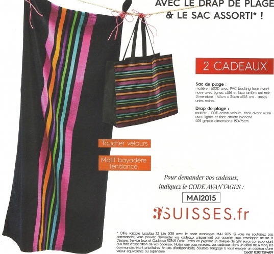 Coucou recu ce matin 3 suisses sac de plage et drap de plage assorti voici le code MAI2015 fdp