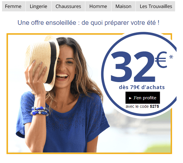 *Bénéficiez d'une réduction de 32€, dés 79€ d'achats facturés, dans la collection Printemps-Eté 2019. Offre personnelle valable une seule fois jusqu'au 22 mai 2019 inclus, non cumulable avec une autre offre en cours et non utilisable sur les prix rouges, prix barrés et articles déjà démarqués. Cette offre n'est pas cessible, n'est pas utilisable partiellement et ne donnera droit à aucune contrepartie monétaire sous quelque forme que ce soit. Il n'exclut pas le paiement de la participation aux frais de traitement de la commande.