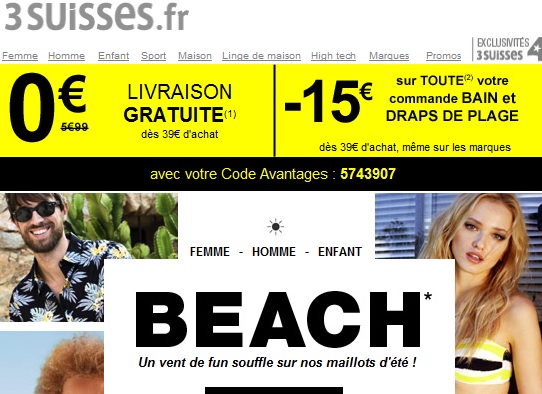 (1) Offre 15€ de réduction valable sur 3Suisses.fr du Vendredi 30 Mai au Lundi 16 Juin 2014 inclus,