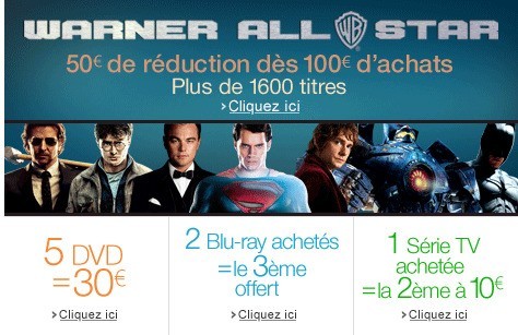 Sur Amazon jusqu'au 23 février inclus,vous pouvez bénéficier d'une réduction immédiate de 50€ sur Warner All Star si vous totalisez un panier d'un montant total de 100€ parmi les DVD, séries Tv et Blu-ray de la sélection.