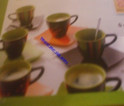 6 tasses (diamètre 3.7 cm, hauteur 7 cm) + 6 sous tasses (11 x 11 cm)