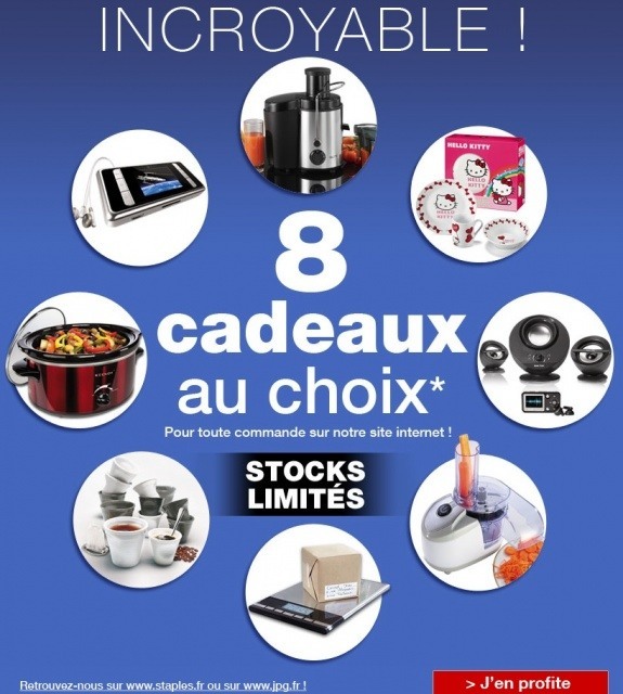 Offre réservée exclusivement aux professionnels destinataires de nos messages et catalogues, valable une seule fois par client pour toute commande passée uniquement sur STAPLES - Mobilier de bureau, Fournitures de bureau, Cartouches d encre, Services Gnraux ou Mobilier de bureau, Fournitures de bureau, Cartouches d encre, Services Généraux, Papiers, Informatique - JPG jusqu’au 16/05/2012. Les cadeaux ne sont pas cumulables entre eux ainsi qu'avec toute autre offre cadeau en cours, y compris l’offre du fauteuil URANUS, sauf mentions contraires expressément indiquées et dans la limite des stocks disponibles. Pour en profiter, il vous suffit d'ajouter le code du cadeau que vous avez choisi dans votre panier. En cas d'annulation ou retour de tout ou partie de la commande, le cadeau doit être restitué. Cette offre ne s'applique ni sur les produits postaux (timbres, enveloppes prêt-à-poster...), ni sur les garanties, ni sur les services.
