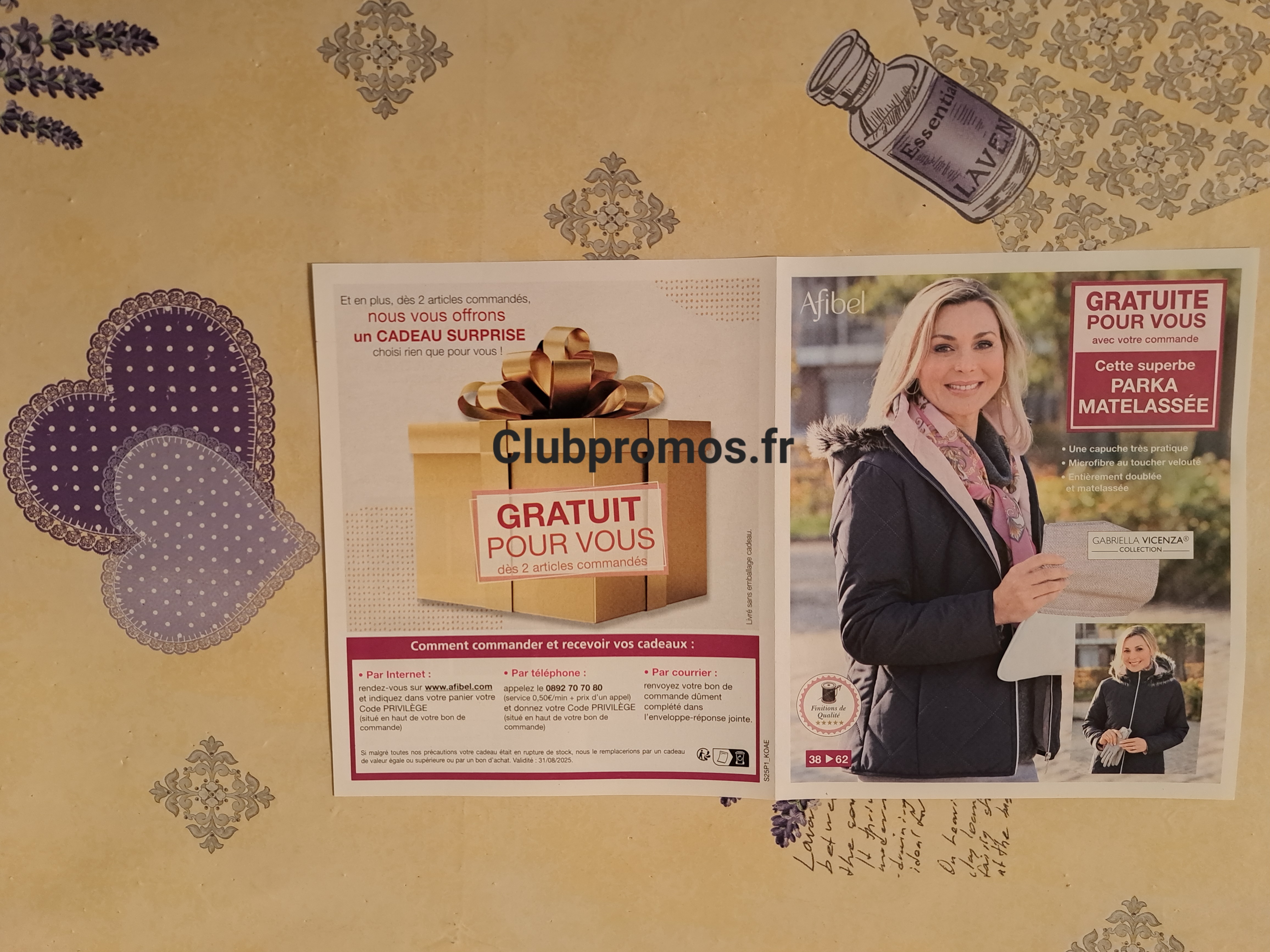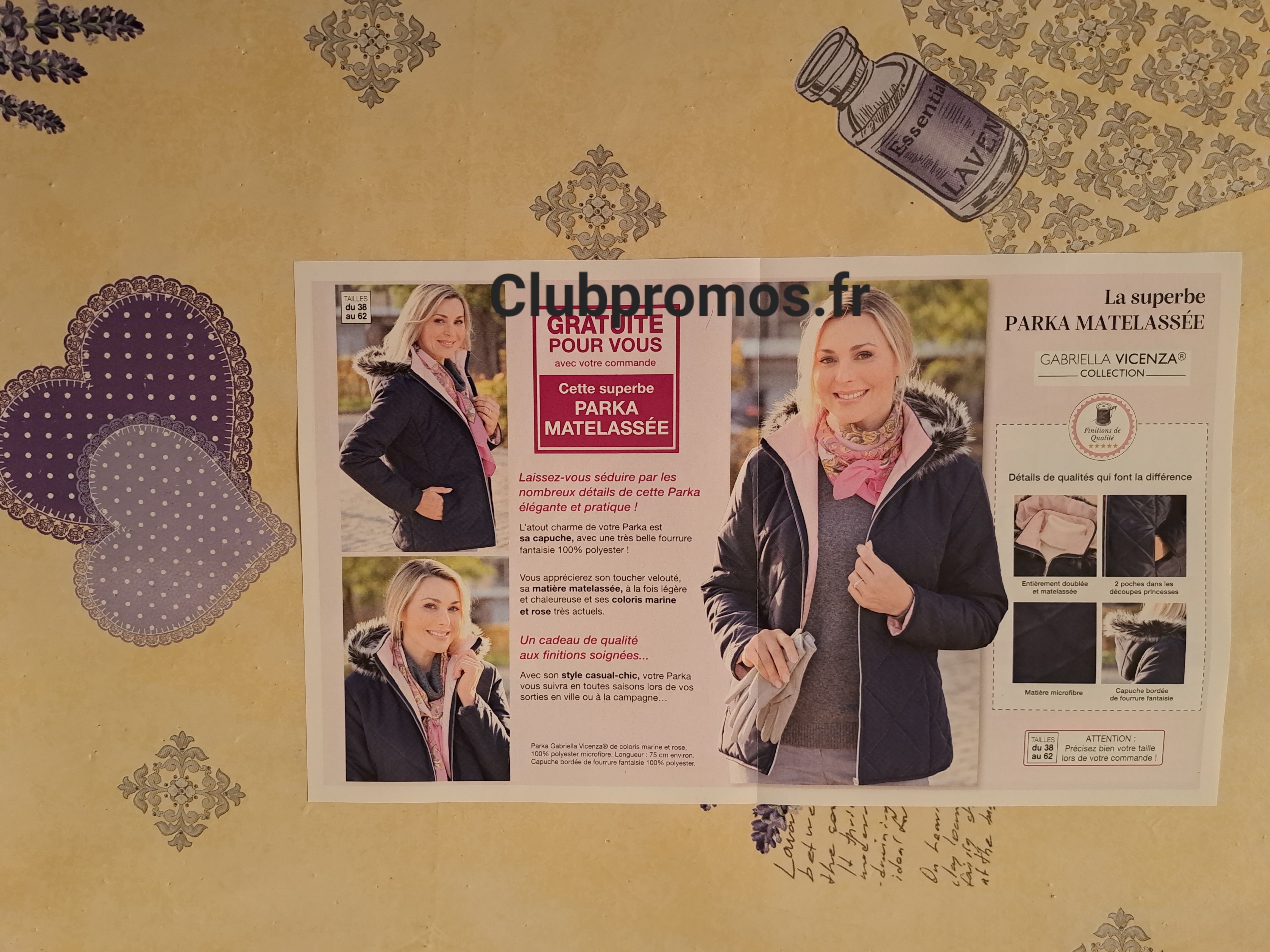 de chez Afibel qui donne en cadeaupour toute commande une jolie parka matelassée "Gabriella Vicenza" Collection, coloris : marine et rose, taille du 38 au 62, matière : 100% polyester, longueur : 75 cm, voir photos