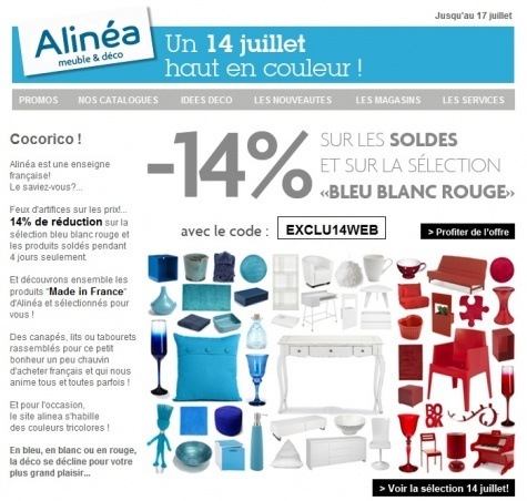Du 13 au 17 juillet 2012, profitez d'une réduction de 14% sur les produits soldés et sur les produits de la sélection «bleu blanc rouge» du 14 juillet, avec le code promotionnel «EXCLU14WEB». L'offre est valable uniquement sur le site Alinéa.