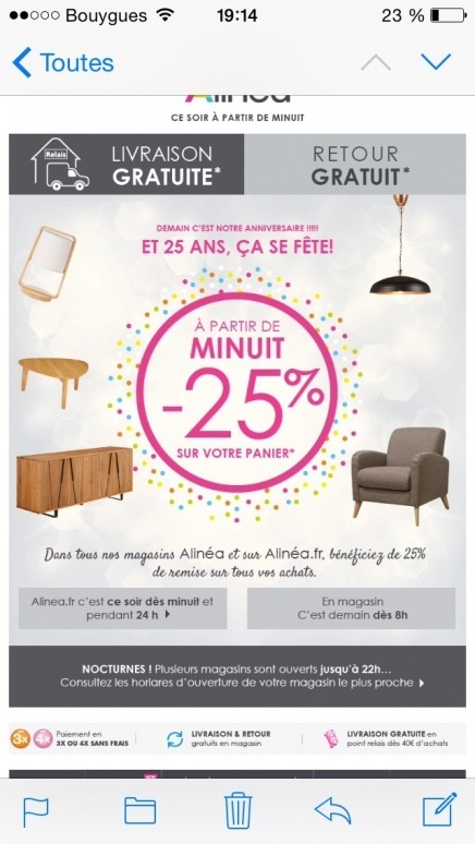À partir de minuit ce soir sur Alinea.fr et toute la journée demain en magasin, -25% sur tous vos achats à l'occasion des 25 ans de l'enseigne.​