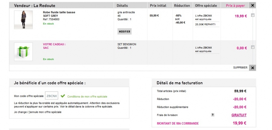 y a pas beaucoup de reduc j'ai l'impression sur le site....du coup, vu que les prix sont à la base excessifs à la redoute, avec es codes alphas ca ne donne pas de super reduc...