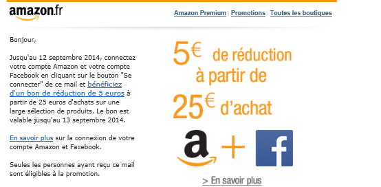 Bonjour, j'ai reçu un mail d'Amazon pour avoir une réduction de 5€ dès 25€ d'achat sur les produits neuf vendues et expédiés par Amazon pour les personnes ayant reçu le mail ou en connectant son Facebook à son compte Amazon via le lien suivan t: https://www.amazon.fr/gp/feature.html/ref=connem_fr_aug14?docId=1000819853&&tag=clubpromos-21