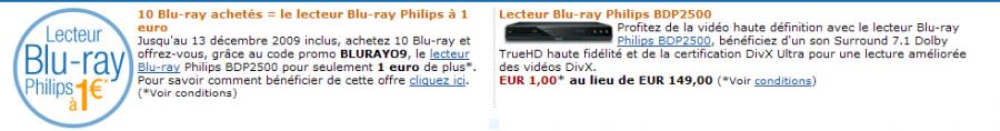 Jusqu'au 13 décembre 2009 inclus, achetez 10 Blu-ray et offrez-vous, grâce au code promo BLURAYO9, le lecteur DVD blu-ray Philips BDP2500 pour seulement 1 euro de plus*. Pour savoir comment bénéficier de cette offre. (*Voir conditions)