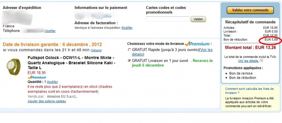-30% de réduction sur des milliers de montres et bijoux du 3/12/2012 au 31/12/2012 valable sur la sélection ci dessous : Code : KDONOEL1 Amazon.fr : Montres J'ai testé sur une montre déjà en promo, la réduction s'applique
