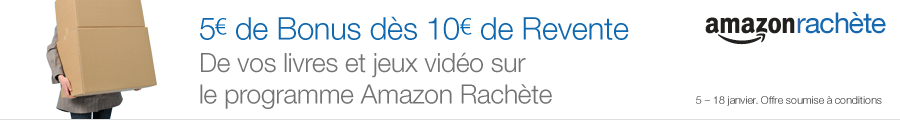 En home page sur Amazon, il est annoncé un bonus de 5€ dès 10€ de revente sur les livres et jeux vidéos sur le programme Amazon Rachète, et cela , jusqu'au 18 janvier !