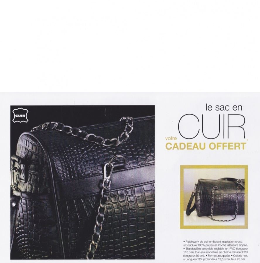 Cadeau : un sac en cuir noir Anne Weyburn (forme bowling avec deux anses chaînette) : dimensions 30 cm de Longueur x 20 cm de Hauteur x 12,5 de profondeur.