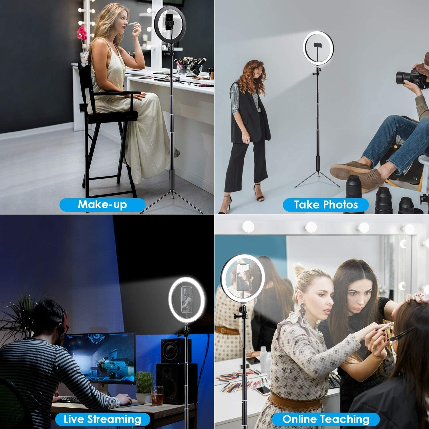 - 【Usages multiples】Notre lampe annulaire est un outil d'éclairage très professionnel, qui convient à de nombreuses occasions, un éclairage parfait pour le maquillage, la diffusion en direct, le selfie, la prise de vue vidéo, l'enseignement en ligne, la photographie de nuit, etc. L’ anneau de lumière est facile à ranger et peut être transporté n'importe où sans prendre beaucoup de place.