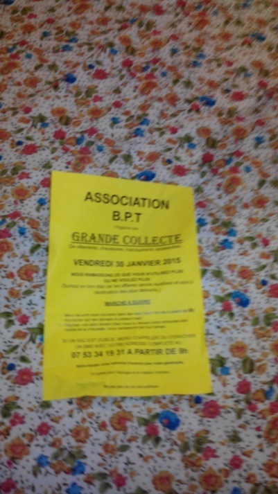 Bonsoir, ce petit message pour vous prévenir de l'arnaque qui revient chaque année ! Un petit mot jaune glissé dans la boite aux lettres, pour vous inciter à laisser vêtements, chaussures et cie dans un sac sur le trottoir ! Sachez que les vêtements seront revendus en friperies et en aucun cas donné à des nécessiteux.