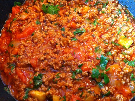 Préparer la farce dans une poêle, faire revenir les oignons émincés dans de l'huile, ajouter la viande hachée, la sauce tomate. saler et poivrer.