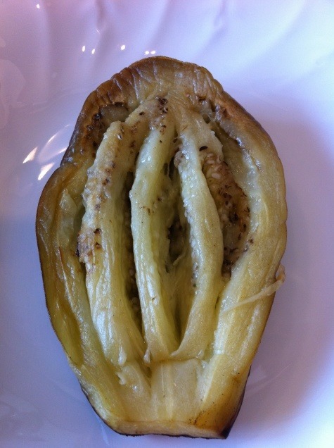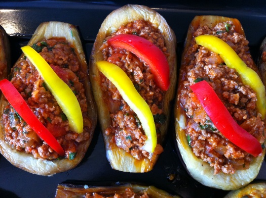 Fendre les aubergines sur la longueur et y déposer avec une cuillère la farce.