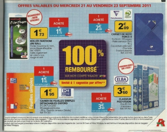 Jasmin75 Habitué 8 Avril 2007 1 513 106 1 560 Paris 17 Septembre 2011 #1 4 articles scolaires limité à 1 remboursement par carte 1 roller Fanthom UNIBALL 1 cahier de feuille détachable Oxford 1 cahier Clairefontaine 1 classeur polyvision Elba Fichiers joints auchan.jpg 107.7 KB · Affichages: 194 Dernière édition: 17 Septembre 2011